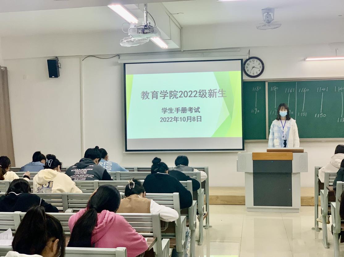 为使2022级新生尽快适应学校的教育教学和生活秩序,帮助新生知悉学校的各项规章制度,树立良好的行为规范,Beat365中文官方网站在组织新生学习学校各项管理规定的基础上,于2022年10月8号晚在1号教学楼开展新生《学生手册》应知应会知识点考试,全院49个新生班级近200名同学参加了考试,全体新生辅导员担任监考工作,学院分管副书记孟向红和团总支负责人黄莹莹担任巡考检查工作。