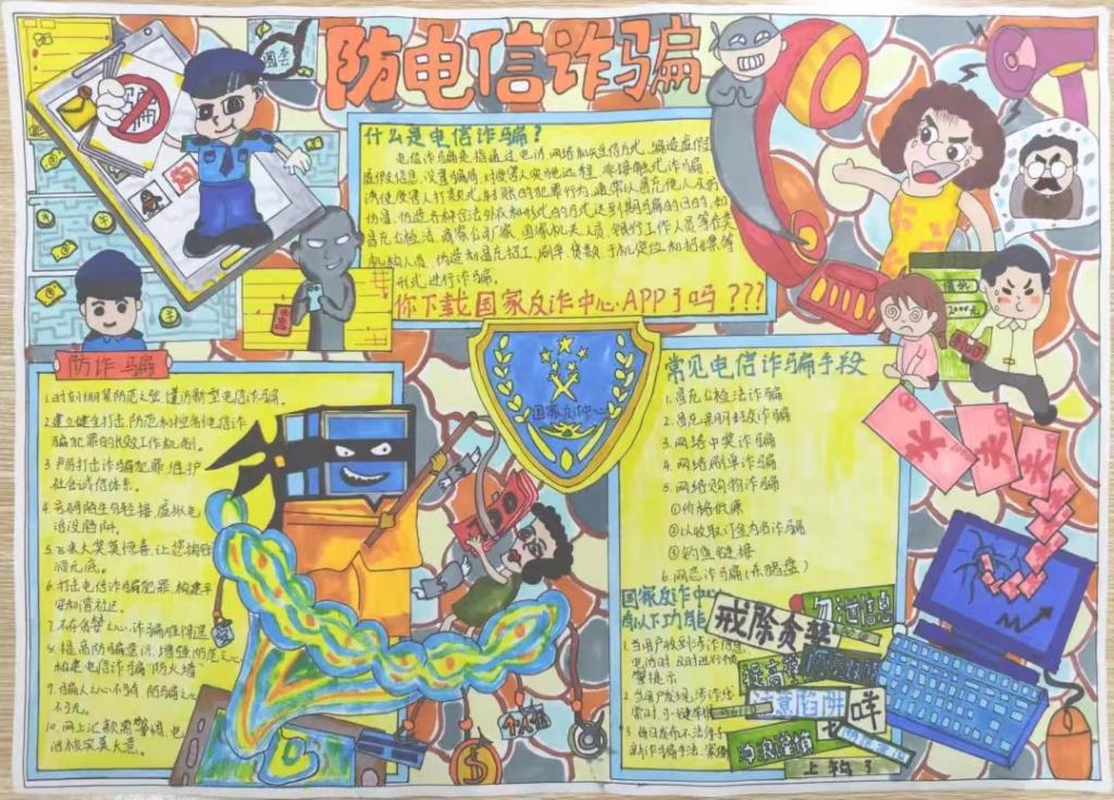 宣传增强防范之心,画纸营造反诈氛围。Beat365中文官方网站于10月上旬开展“反电诈,防电诈”手抄报活动,Beat365官网青年学子积极响应,纷纷投稿,共收到近300件作品。通过团总支微信公众号投票、评委老师打分等多轮选拔,共遴选出18份获奖作品,其中一等奖3名,二等奖5名,三等奖10名。21级学前教育1班华蕾蕾的作品以国家反诈中心标志为原型制作手抄报进行知识宣传,呼吁同学们要做到人人下载安装国家反诈中心APP。22级汉语言文学4班刘嘉诚的作品则通过顺口溜和标语告诫大家要时刻紧绷防范之弦,形式新颖有趣。同学们围绕反电诈、防电诈等相关知识,以独特的视角创作出生动形象、寓意深刻的反电诈手抄报,生动再现了网络诈骗层出不穷的手段及应对方法,有力的唤醒了全院师生反诈骗意识。