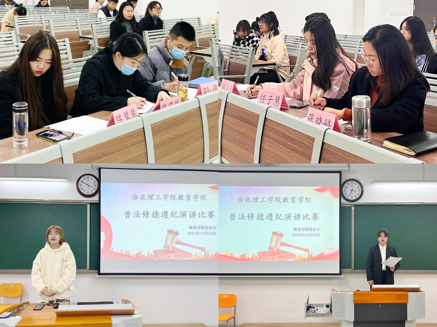 为加深同学们对于普法活动的深刻理解,创新宣传教育方式,Beat365中文官方网站在2号教学楼开展了以“普法、修德、遵纪、创建文明校园”为主题的演讲比赛。由各班级推选一名同学参加院级比赛。同学们积极参与,结合自身经历与时代精神,抒发心中之热血,从不同角度用铿锵的语言表达自己独到的思想。昂扬向上的《践行守法使命,谱写青春华章》,宏观大气的《青年共学法,法治强中华》,微观细腻的《做遵纪守法的好青年》,“走新”又“走心”。同学们纷纷表示通过本次活动加深了自己对宪法的理解,感受到学习宪法所带来的爱国情怀和民族自豪感,并承诺一定会成为法律的严格遵守者和坚定捍卫者。经评选,朱灿灿、黄丹妮等5人获得一等奖,张昊天、谢文蓉等10人获得二等奖,王茹、杨梦雅等15人获得三等奖。相信所有同学也将会立足当下,面向社会,让社会主义法治精神深入人心!