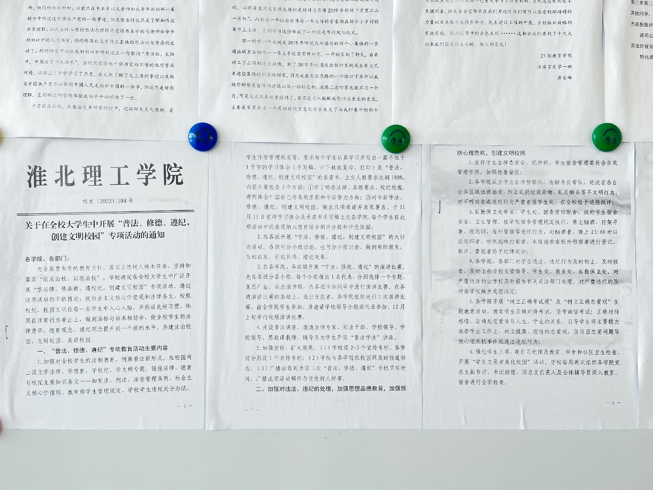 为促进同学之间互相理解,增进活动效果,各班级组织开展普法讨论活动。同学们积极参与,学习相关的法律条例、视频等,各抒己见,谈收获、谈体会。并纷纷感叹,要凝聚青年力量,学习法治思想,诠释社会主义法治精神。