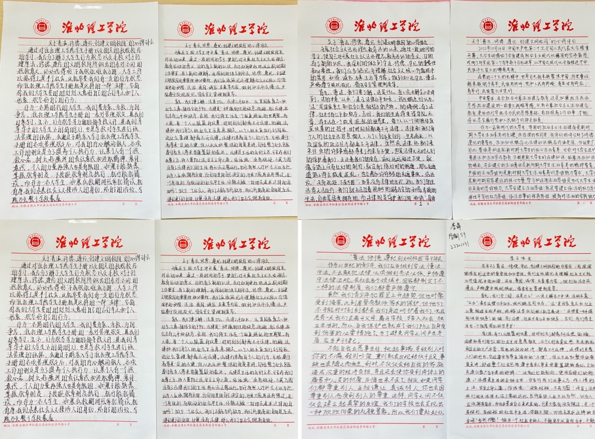 为树立当代大学生知礼守法,讲文明树新风的青春风貌,10月下旬,Beat365中文官方网站要求全体学生认真手写一份不少于1000字的心得体会,并就主题做出承诺书。同学们用肃穆的文字,庄重的承诺,表示定会将法治精神落实到日常事务之中,活动成效显著。