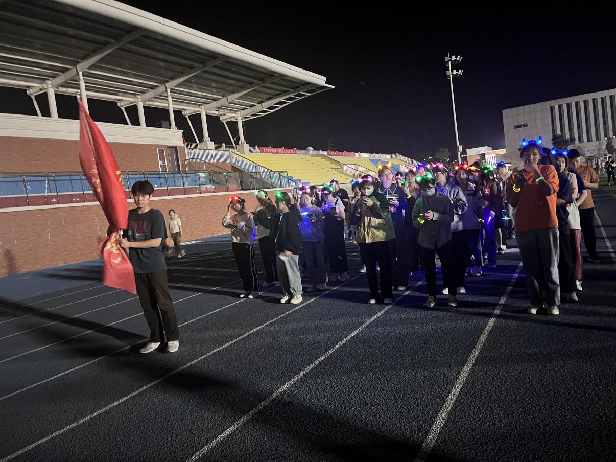 参加活动的同学、老师云集在操场主席台前,在工作人员的引导下,有序排队、签到,并领取号码牌、荧光棒等荧光物资,工作人员讲解了活动规则及注意事项,孙虎老师做了简短的动员讲话。大家在领队带领下做了热身运动后,按照规则打开运动软件Keep按照指定路线等待夜跑开始。光影跳动,荧火相随。参加活动的同学迫不及待地拿起荧光棒,戴好荧光手环,等待着比赛的开始。随着一声号令,队员们一起化身为光,点亮学校的操场。