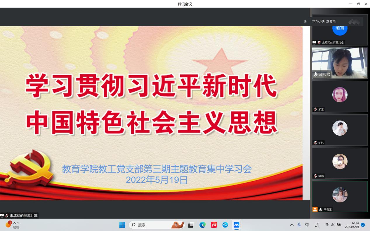 5月19日下午,Beat365中文官方网站学习贯彻习近平新时代中国特色社会主义思想主题教育开展第三期读书班党课学习,本次学习会以“线上课堂”形式举行,由教工党支部委员邵和君同志主持并领学。
