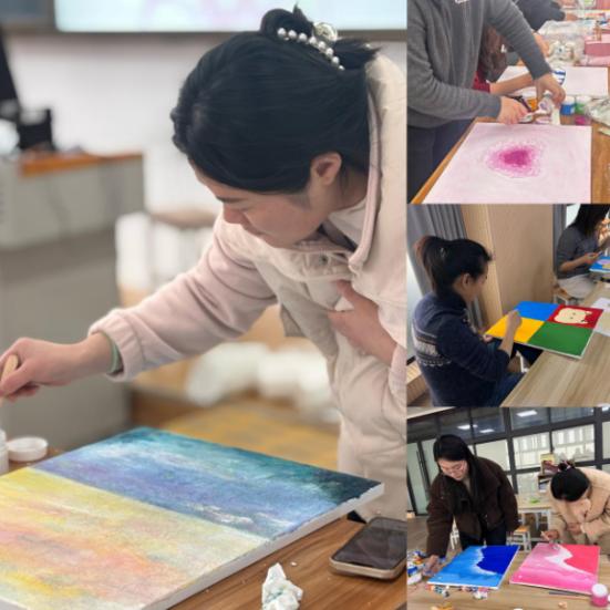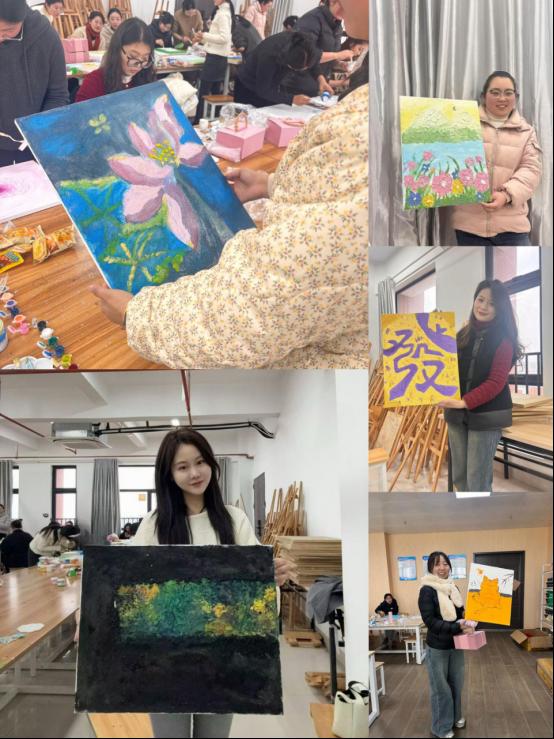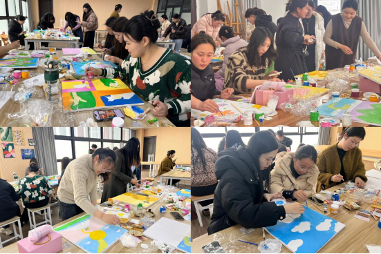 在创作过程中,学院为教师们提供了丰富的创作材料,大家纷纷发挥创意,利用不同的材料和技法,独立完成了一幅幅独特的肌理画作品。这些作品不仅展现了教师们对艺术的理解和感悟,更体现了她们的创造力和团队协作精神。活动现场气氛热烈,教师们在创作中放松身心,感受艺术的魅力,同时也增进了彼此之间的沟通与交流。
