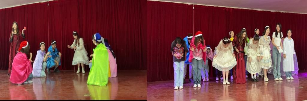 演出由任庄幼儿园小朋友和理工学院的21级普本同学交叉呈现,21级普本同学共准备了三个精彩的节目。第一组同学们在大一班手势舞《美好的三年时光》和大二班合唱《最美的花季》后,呈现了故事剧《白雪公主》,其生动鲜活的演绎瞬间将现场观众带入如梦似幻的童话之境,一下就牢牢的吸引住了台下的小朋友;