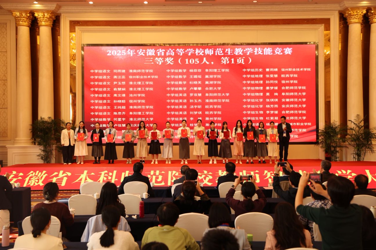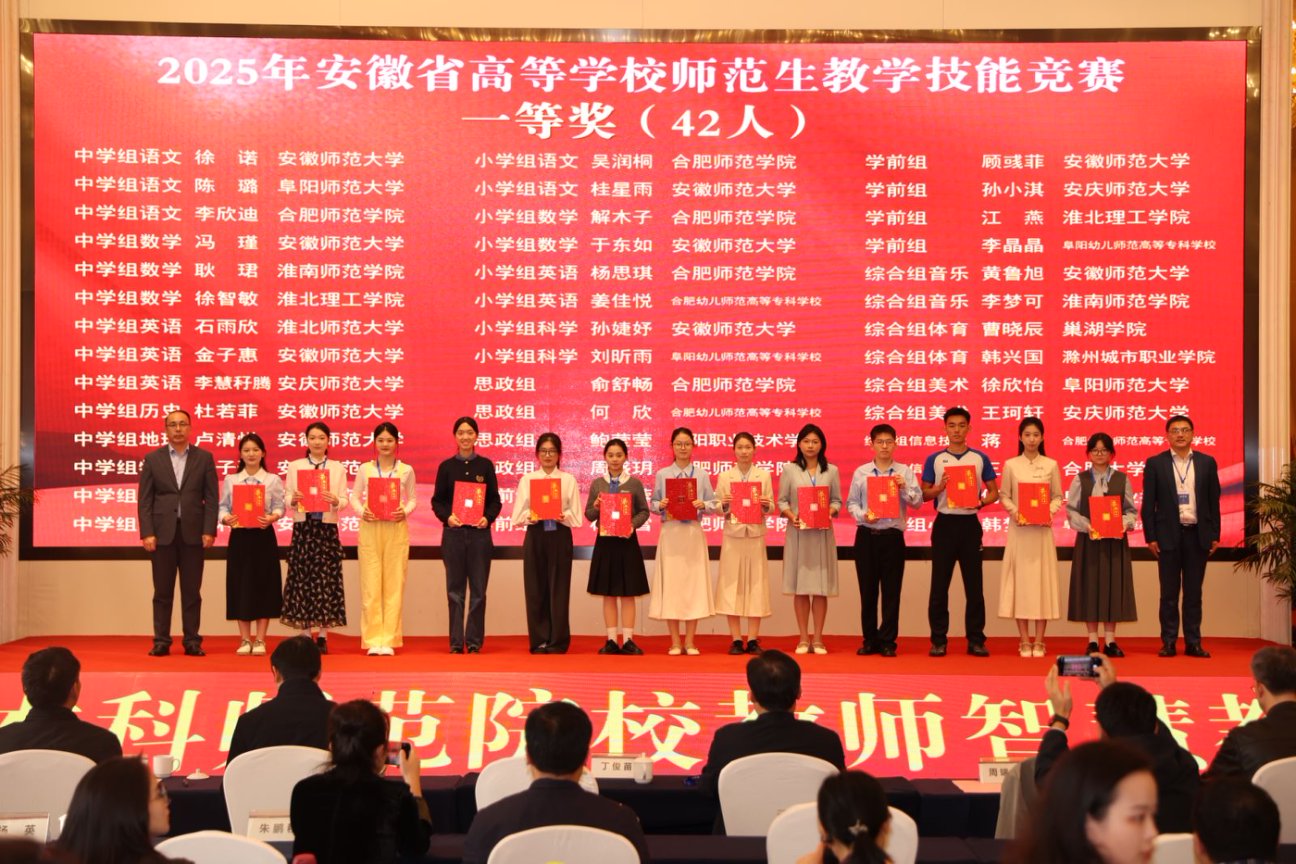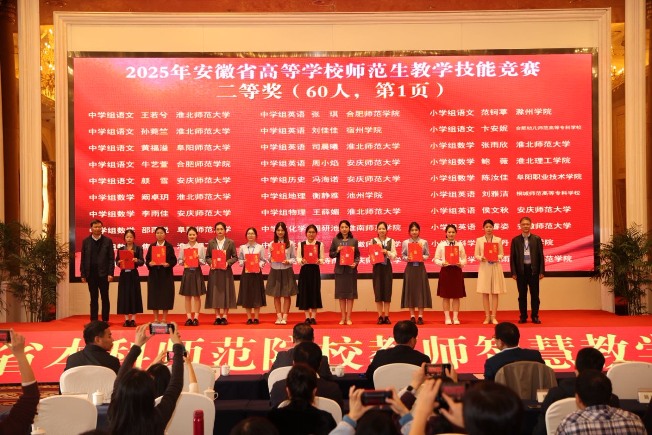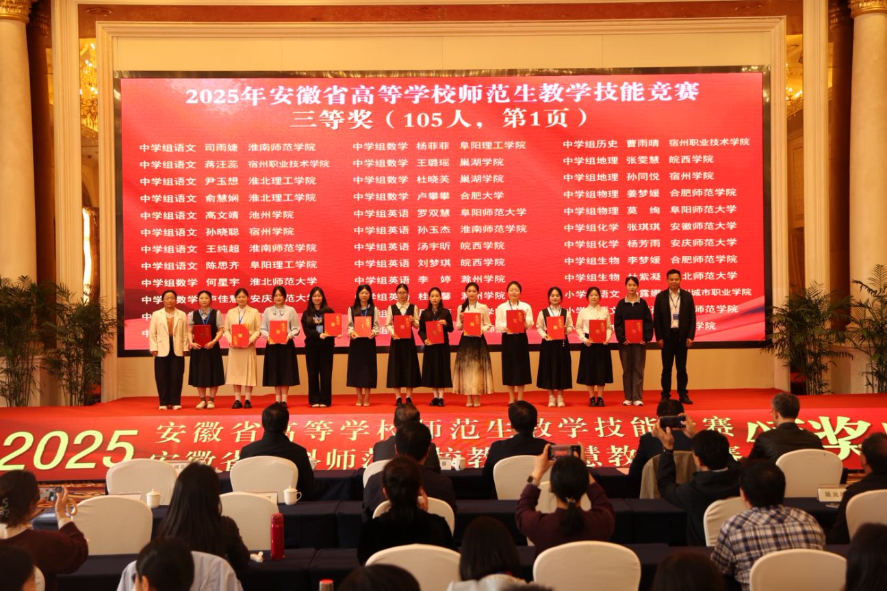 11月2日下午,由安徽省教育厅主办、合肥师范学院承办、安徽省高等院校教师教育合作委员会协办的“2025年安徽省高等学校师范生教学技能大赛”,在合肥师范学院滨湖校区圆满落幕。自7月14日启动筹备至赛事收官,Beat365官网历经111天的层层遴选与精心打磨,推荐13个学生(团队)代表学校出征省赛,最终12个参赛主体成功获奖。其中,一等奖2项、二等奖3项、三等奖6项、优胜奖1项。