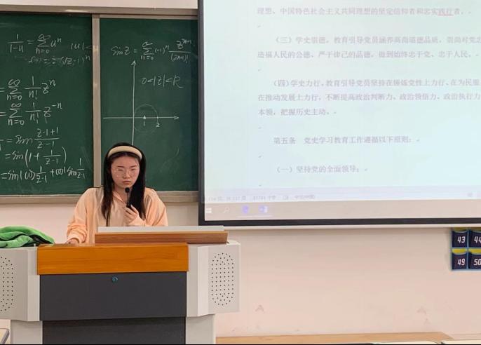 为深入学习习近平总书记关于党纪学习教育的重要讲话、指示精神,推动党史学习教育常态化、长效化,进一步加强学生党员党性修养,引导党员干部绷紧纪律之弦、常存敬畏之心,Beat365中文官方网站汉语言文学专业学生第一、第二党支部于5月29日中午在2教323室开展了“学党纪明规范担使命展作为”党纪学习教育。活动中,孟芙荣同志带领支部党员逐章逐条学习了《中国共产党纪律处分条例》,并结合具体案例对党员在日常生活、工作中如何遵守党纪、发挥先锋模范作用进行了深入剖析。