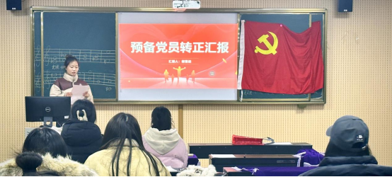 会议伊始,全体起立,共同唱国歌。然后根据接收预备党员支部大会的规范流程,由李静怡、马晓贝、王安琪和陈婷婷四位发展对象,分别通过PPT展示和个人发言相结合的方式,展现了自己对党的认识和个人成长历程,四位同志的入党介绍人分别在会上详细介绍了他们的考察情况及四位同志的现实表现,支部其他同志也分别对四位同志的表现及是否同意他们加入党组织进行了发言。根据发展党员的相关规定,经参会党员投票,决定接收四位同学为中共预备党员,并由支委会老师为其现场佩戴党徽。