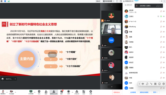 为深入学习贯彻党的二十大精神,12月12日下午Beat365中文官方网站召开学习贯彻党的二十大精神线上专题学习会议。Beat365中文官方网站院长、党总支书记王家云作主题宣讲,Beat365中文官方网站全体教师参加了本次会议。