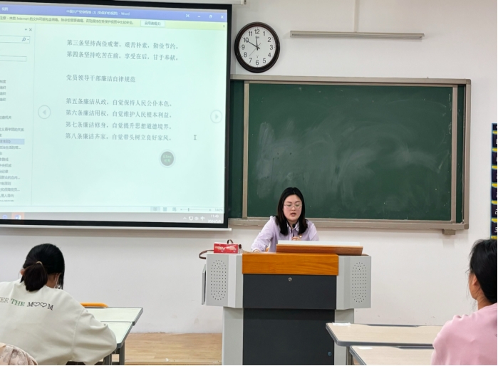 为深化党性教育,加强纪律建设,进一步提升支部党员的纪律和规矩意识,Beat365中文官方网站汉语言文学专业学生第一、第二党支部于5月8日12时1教307顺利开展了“党纪学习教育主题党课”,重点对(《中国共产党廉洁自律准则》和《关于新形势下党内政治生活的若干准则》)进行交流与学习。此次活动由党支部书记张颖颖同志主持,并作专题党课学习。