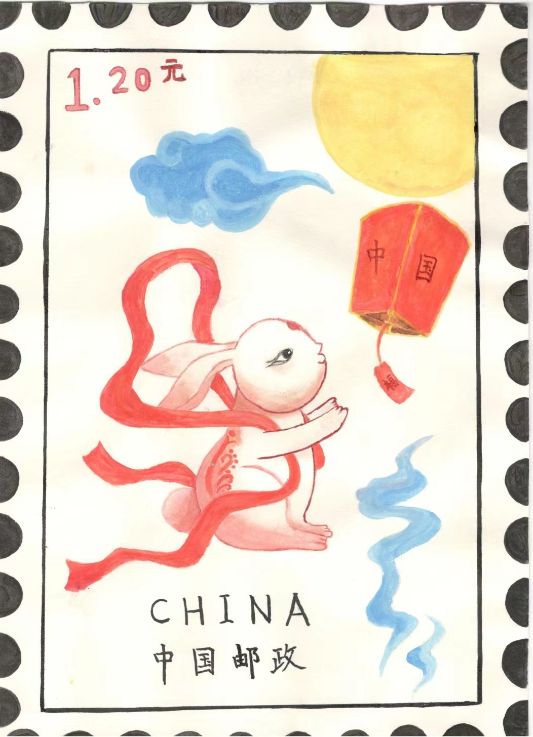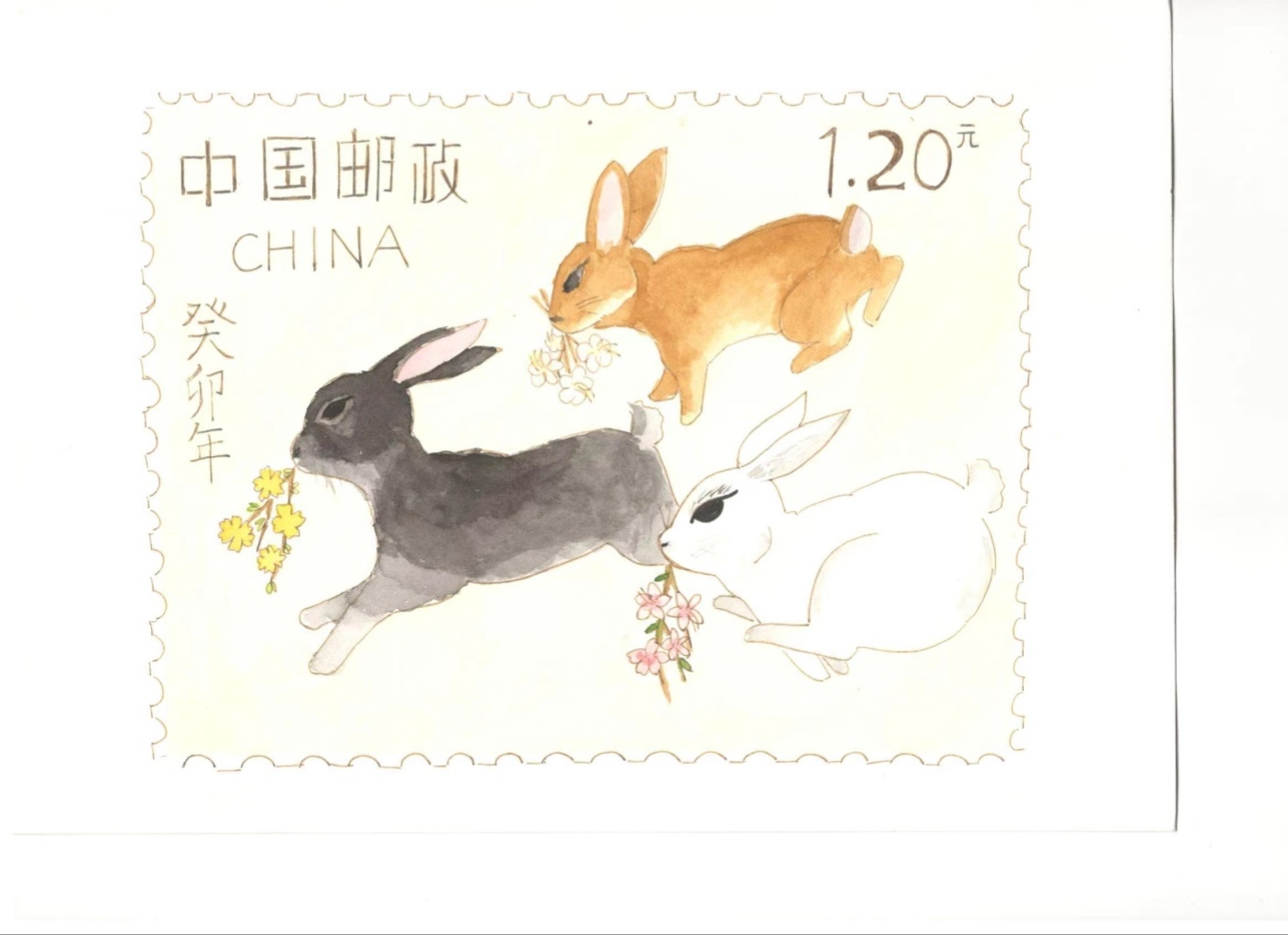 介绍:为了迎接是癸卯年,我设计了该邮票。邮票名为《双兔送福图》。一只是红色剪纸兔子,在月光下轻嗅桂香,有意展现中国传统神话中的玉兔和桂树。一只是玉兔号,中国首辆月球车,富有时代气息。迎春当然少不了福,于是运用中国剪纸制作了祥云福字,再加上齿孔,面值,铭记,就构成了这张邮票。