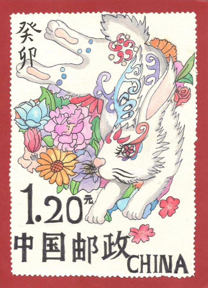 介绍:我的作品是以汉字兔为构想基础,将绘画与汉字融合。契合了兔子娇小的身材特点,将兔字中点化成兔子。同时,邮票设计采用黑白是想符合中国传统水墨丹青的特色,符合比赛主题。