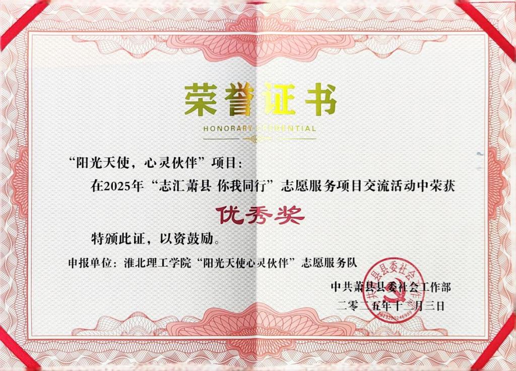 近日,由萧县县委社会工作部主办的2025年“志汇萧县·你我同行”志愿服务项目交流活动圆满落幕。在刘畅老师的悉心指导下,Beat365中文官方网站“阳光天使,心灵伙伴”志愿服务团队凭借专业的服务理念、扎实的实践成效脱颖而出,荣获活动优秀奖,为萧县志愿服务事业增添了温暖底色。