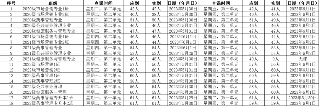 为全面推进本科教育水平评估工作,bat365官方官网党委积极组织学生党员开展查课工作,于6月3日,对第十三周的查课情况做出总结。本周查课以严谨认真的态度对迟到、旷课、带早餐的学生进行了督促和教育。学生党员进入每间教室内检查学生出勤情况。经过一周的督查,学院共查18个班级36节课,覆盖学院全体20级、21级、22级及22级专升本共952名学生。现查课通报如下:
