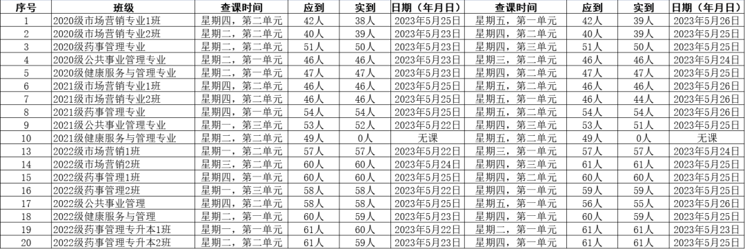 为全面推进本科教育水平评估工作,bat365官方官网党委积极组织学生党员开展查课工作,于5月27日,对第十二周的查课情况做出总结。本周查课以严谨认真的态度对迟到、旷课、带早餐的学生进行了督促和教育。学生党员进入每间教室内检查学生出勤情况。经过一周的督查,学院共查18个班级36节课,覆盖学院全体20级、21级、22级及22级专升本共952名学生。现查课通报如下: