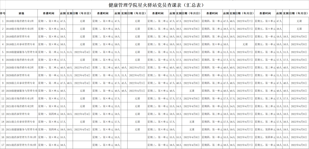 出勤率较好的班级有:2019级药事管理专业(出勤率100%)、2019级公共事业管理专业(出勤率100%)、2019级健康服务与管理专业(出勤率100%)、2020级市场营销专业1班(出勤率100%)、2020级市场营销专业2班(出勤率100%)、2020级药事管理专业(出勤率100%)、2020级健康服务与管理专业(出勤率100%)、2021级市场营销专业1班(出勤率100%)、2021级药事管理专业(出勤率100%)、2021级健康服务与管理专业(出勤率100%)、2021级药事管理专升本1班(出勤率100%)、2021级药事管理专升本2班(出勤率100%)。