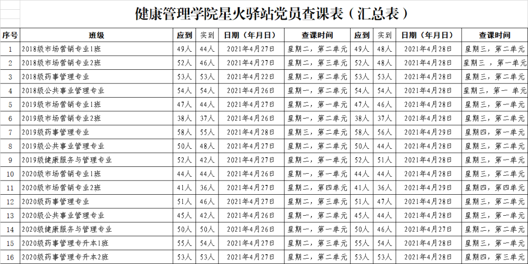 出勤情况较好的班级有:2018级药事管理专业(出勤率100%)、2018级公共事业管理专业(出勤率100%)、2020级市场营销专业1班(出勤率100%)、2020级药事管理专升本2班(出勤率100%)