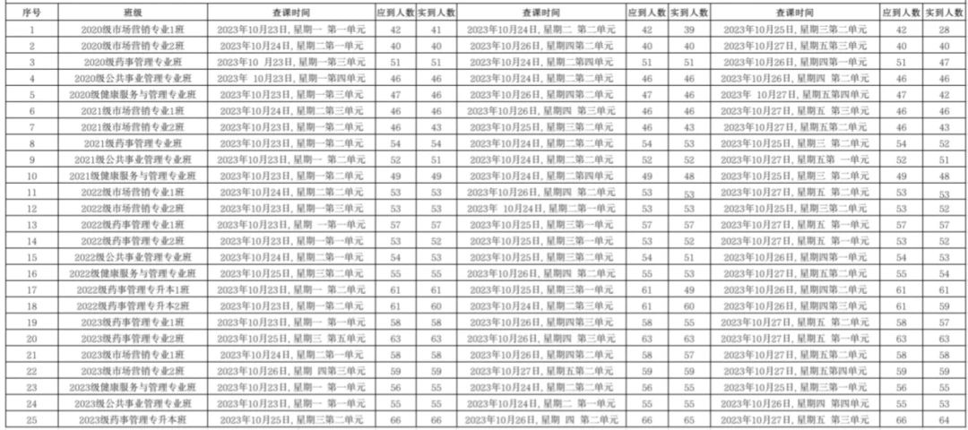 为全面推进本科教育水平评估工作,bat365官方官网党委积极组织学生党员开展查课工作,于10月29日,对第九周的查课情况做出总结。本周查课以严谨认真的态度对迟到、旷课、带早餐的学生进行了督促和教育。学生党员进入每间教室内检查学生出勤情况。经过一周的督查,学院共查25个班级75节课,覆盖学院全体20级、21级、22级、23级、22级专升本以及23级专升本共1335名学生。现查课通报如下:
