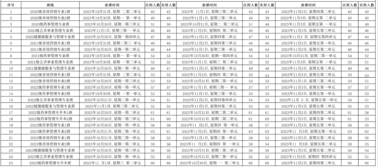 为全面推进本科教育水平评估工作,bat365官方官网党委积极组织学生党员开展查课工作,于11月5日,对第十周的查课情况做出总结。本周查课以严谨认真的态度对迟到、旷课、带早餐的学生进行了督促和教育。学生党员进入每间教室内检查学生出勤情况。经过一周的督查,学院共查25个班级75节课,覆盖学院全体20级、21级、22级、23级、22级专升本以及23级专升本共1335名学生。现查课通报如下: