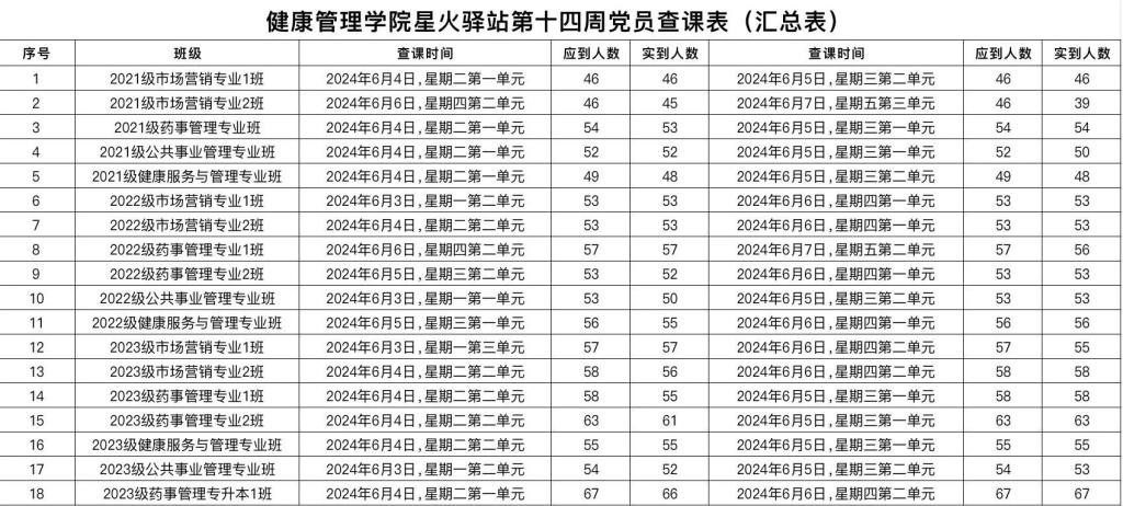 为加强学院学风建设,规范课堂秩序,营造良好的学习氛围,bat365官方官网党委积极组织学生党员开展查课工作,于6月9日,对第十四周的查课情况做出总结。本周查课以严谨认真的态度对迟到、旷课、带早餐的学生进行了督促和提醒。学生党员进入每间教室内检查学生出勤情况。经过一周的督查,学院共查18个班级36节课,覆盖学院全体21级、22级、23级以及23级专升本共982名学生。现查课通报如下: