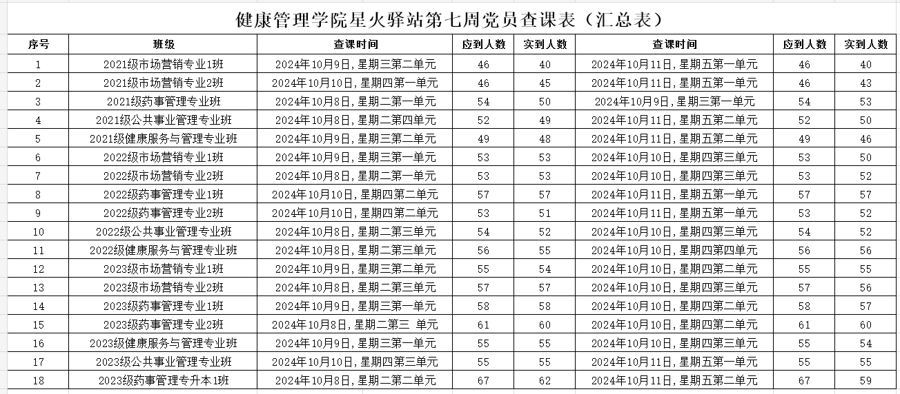 为加强学院学风建设,规范课堂秩序,营造良好的学习氛围,bat365官方官网党委积极组织学生党员开展查课工作,于10月13日,对第七周的查课情况做出总结。本周查课以严谨认真的态度对迟到、旷课、带早餐的学生进行了督促和提醒。学生党员进入每间教室内检查学生出勤情况。经过一周的督查,学院共查18个班级36节课,覆盖学院全体21级、22级、23级以及23级专升本共981名学生。现查课通报如下: