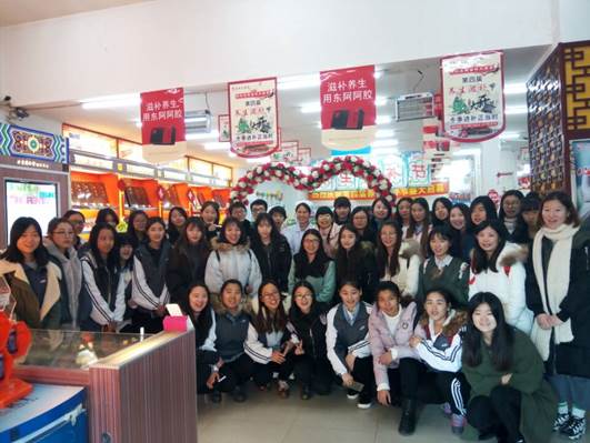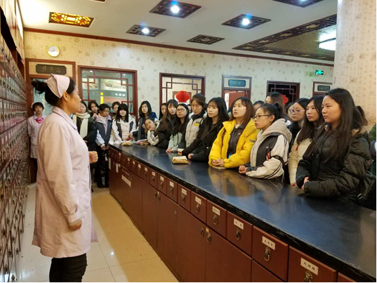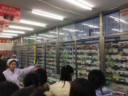 第一站到达吉林大药房位于亚细亚门前的总店,由全国金牌店长全程接待和讲解,使学生了解到国家GSP标准下的药房建设和管理经验,以及药品的陈列、分类、摆放、储藏等知识。同时带领学生们观摩了中药药房饮片的分类、装斗、抓药、打包、付药等一系列过程。学生们神情专注,认真记录,积极提问,探寻答案。