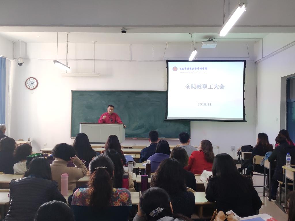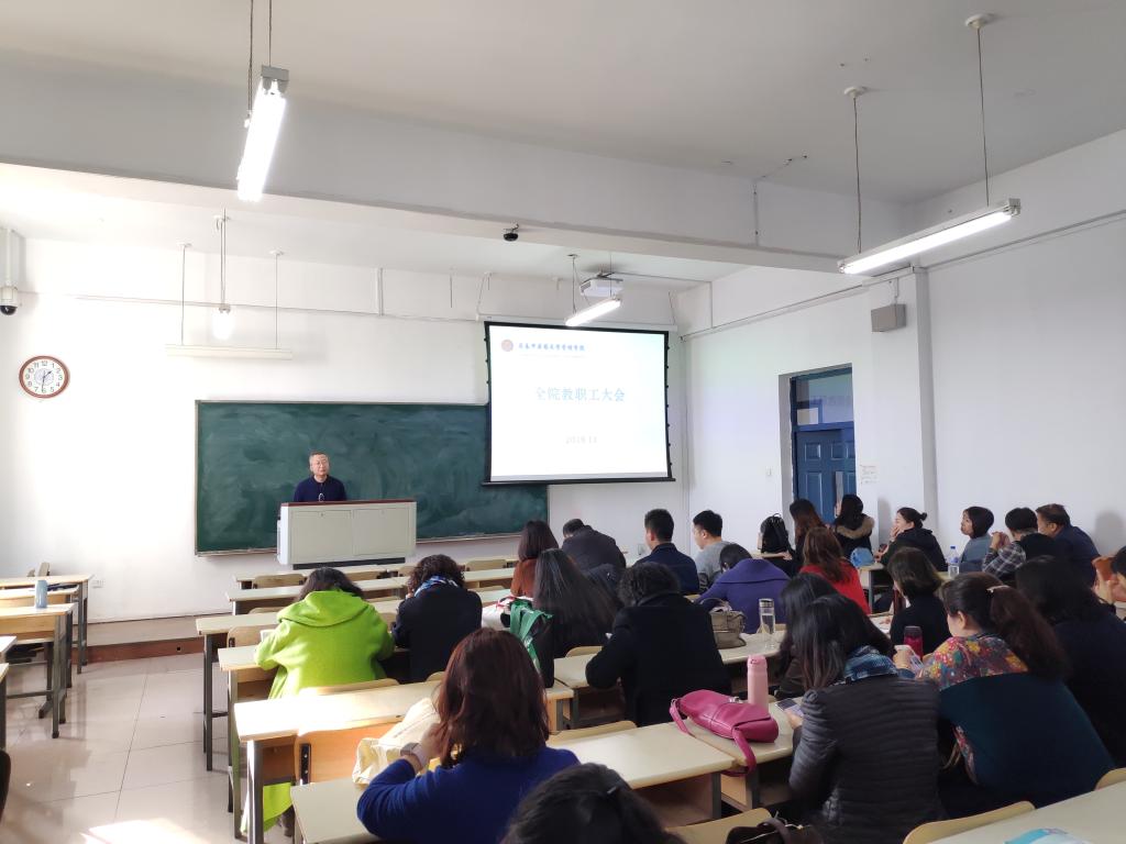 11月7日,bat365官方官网在致知楼1321教室召开全体教职工大会。会上,副院长何占义向全体教师传达了11月6日学校教学例会的会议精神。其中包括近期各项教学工作完成落实情况、本学期期中教学检查工作部署、二级教学单位教学工作评估检查工作等。