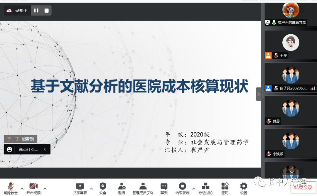 本次研究生学术沙龙,由2020级两名研究生汇报:2020级社会发展与管理药学专业硕士崔严尹的汇报主题是《基于文献分析的医院成本核算现状》,她从发文趋势;主题、机构、期刊分布;关键词;话题维度等四个方面进行详细的分析,让同学们对医院成本核算的现状有了进一步了解;2020级公共卫生专业硕士白子凡的汇报主题是《基于数据挖掘中药的用药规律》,她从数据来源、中药名称规范、药物频次分析、因子分析和聚类分析几个方面入手,结合实例进行讲解,并详细展示SPSS的操作方法,为同学们日后进行论文检索与学习提供了方法。汇报后,同学们就以上两项内容展开讨论。