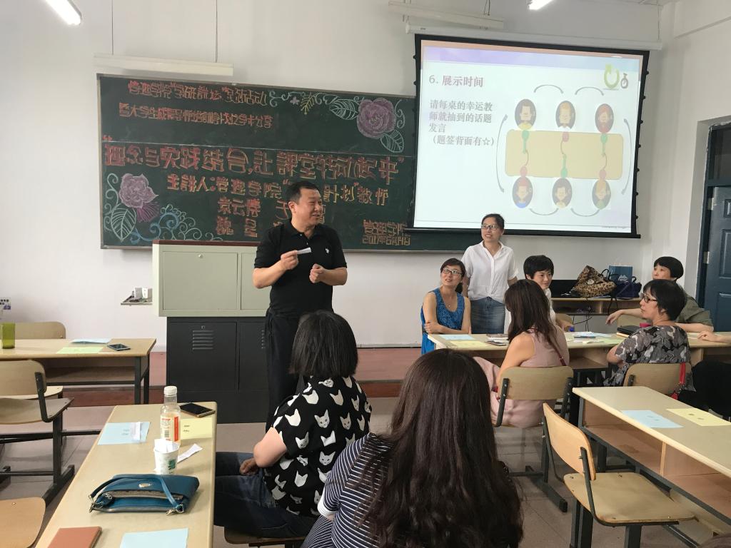 教师袁云博带领全院教师进行了“Round Table”圆桌课堂教学法体验。教师以学生的身份加入课堂,随机抽取问题进行2分钟准备,以一讲一评的方式顺时针交换对象讲解抽取的问题,评价方不断的点评使讲解方对问题的理解面不断扩大和深化。从而增强学生沟通能力、表达能力,让学生学会分析、讲授、倾听、解答问题,从而深化对课堂内容的理解。