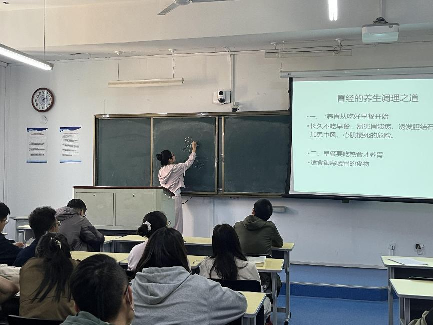 孙嘉淇同学以《黄帝内经十二时辰养生法之胃经》为主题汇报,从胃经养生方法、胃经循行、食疗养胃法、胃经重点穴位四个方面进行汇报,同时采取写板书和与台下同学提问互动的方式,提升同学们对于学术沙龙的热情,汇报内容从中医领域入手,更贴合学校特色,提醒同学们要提升胃部养生保健的观念。