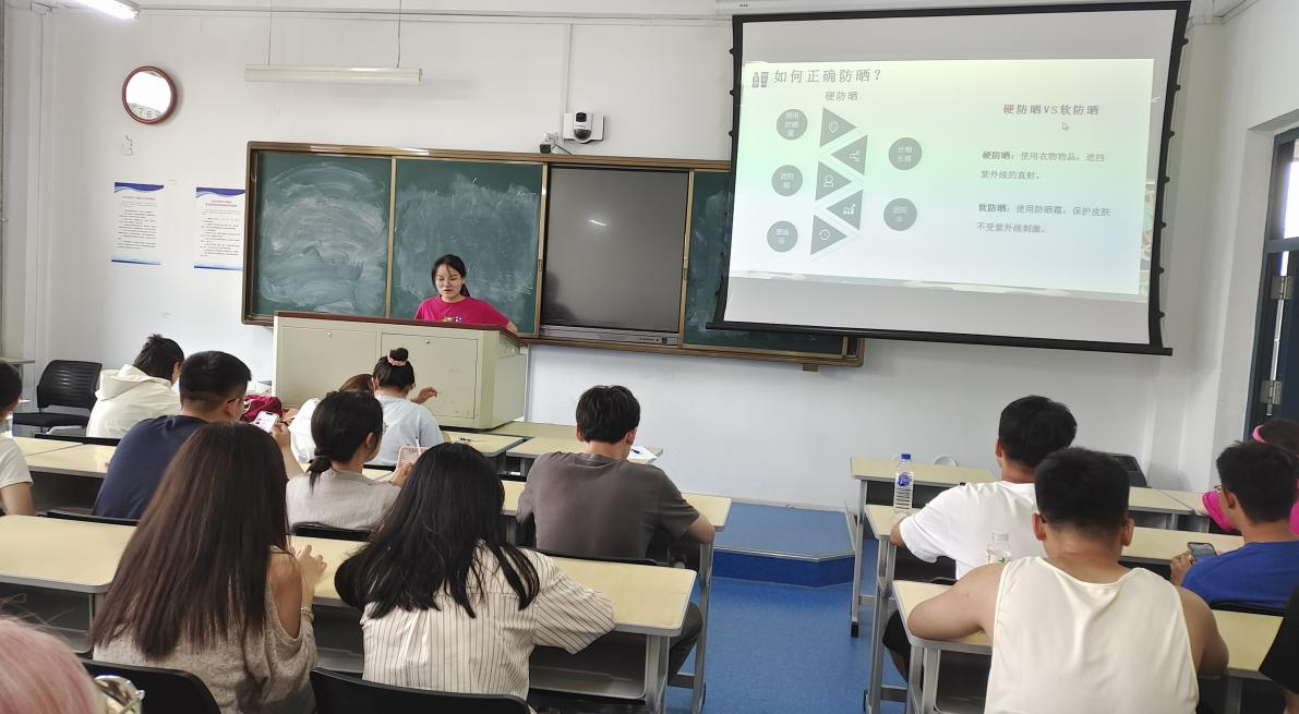 肖谣同学以《夏季防晒》为主题汇报,讲解防晒的重要性、紫外线的危害以及如何防晒,强调夏季一定要注意阳光中强烈的紫外线,同时对比紫外线中对人体伤害最大的UVA和UVB。让同学们了解防晒是一年四季的事,紫外线指数大于2就需要进行防晒,学会使用防晒霜或衣物物品遮挡紫外线的直射,保护皮肤不受刺激。