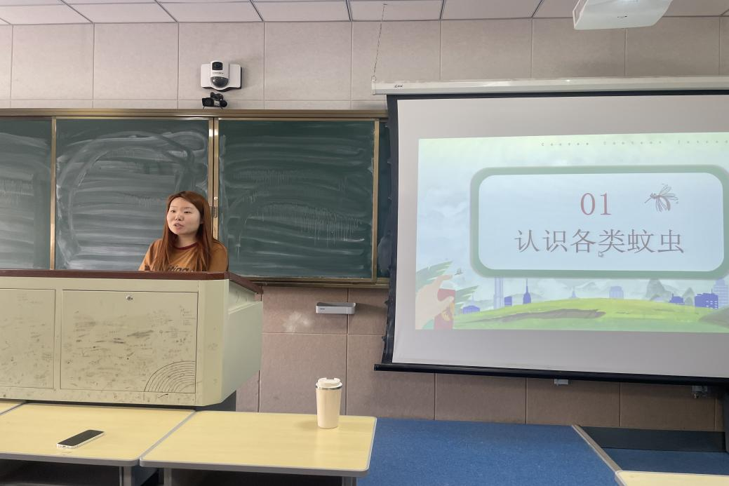 2021级公共卫生专业硕士研究生郭鑫以《夏季蚊虫作战》为主题汇报,带同学们认识各类蚊虫,采用观看视频的方式介绍白蚁,普及各类蚊虫叮咬后应当如何及时处理,以及如何有效预防蚊虫叮咬。