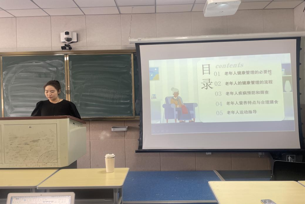 2021公共卫生专业硕士研究生王琢以《老年人健康管理》为主题汇报,从老年人健康管理的必要性讲到老年人疾病预防与筛查,详细介绍老年人健康管理的流程,同时让大家学会如何对老年人的运动和饮食进行指导。