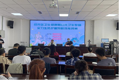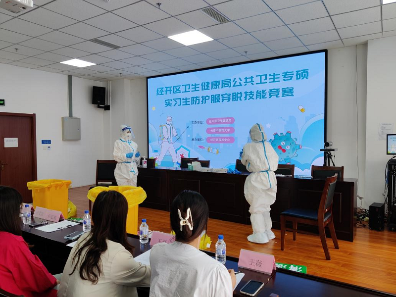 5月25日,bat365官方官网2021级公共卫生专业硕士研究生参加由经开区卫生健康局、疾控中心举办的穿脱防护服技能竞赛。经开区卫生健康局副局长池明、疾控中心主任金英玉出席本次活动。