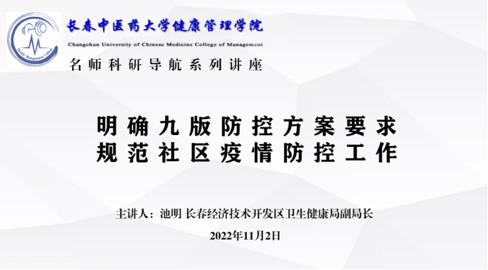 为加强学风建设,进一步提高bat365官方官网硕士研究生的科研能力和培养质量,11月2日,学院邀请长春经济技术开发区卫生健康局副局长池明,做题为《明确九版防控方案要求,规范社区疫情防控工作》的专题讲座。讲座由科研行政秘书郝颜主持,全体2020级、2021级、2022级研究生参加本次讲座。
