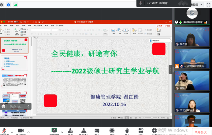 温红娟以 “全民健康,研途有你”为题,从学校简介、学位授权点基本情况、导师责任与义务、硕士研究生培养过程及关键点和学位授予等五大方面,为学生做详细讲解,并对新生入学学业方面的各种疑惑,进行解答,为新生下一步的学习找到方向。