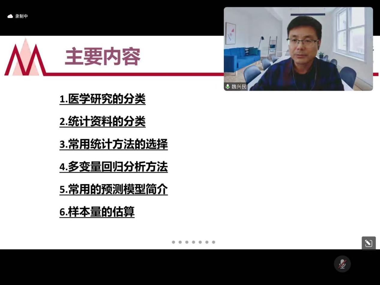 魏院长就本人的研究领域向同学们做简单介绍,还分享本人在研究生阶段的数据挖掘和医学统计学的研究,以及如何提高教学质量和科研投入。魏老师重点讲解科研论文写作中的六个方面,包括医学研究的方法和类型、资料类型的转换和统计方法的选择、数据可视化和统计推断的方法、多重回归分析的方法和注意事项,还强调多重线性回归和逻辑回归在研究危险因素方面的应用以及样本量估算在科学研究中的重要性。