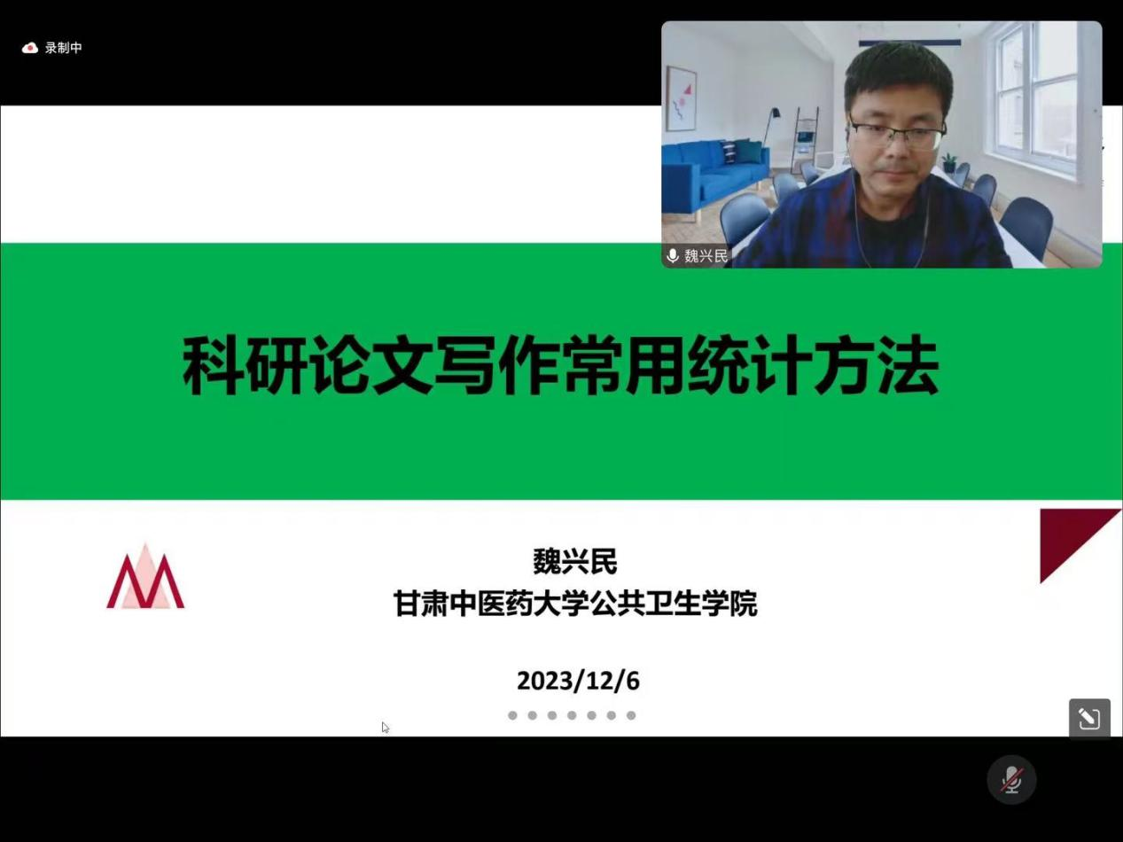 12月6日,学院邀请甘肃中医药大学公共卫生学院副院长魏兴民作题为“科研论文写作常用统计方法”的专题讲座。讲座由学院副院长温红娟主持,科研行政秘书郝颜及全体2022、2023年级硕士研究生参加。