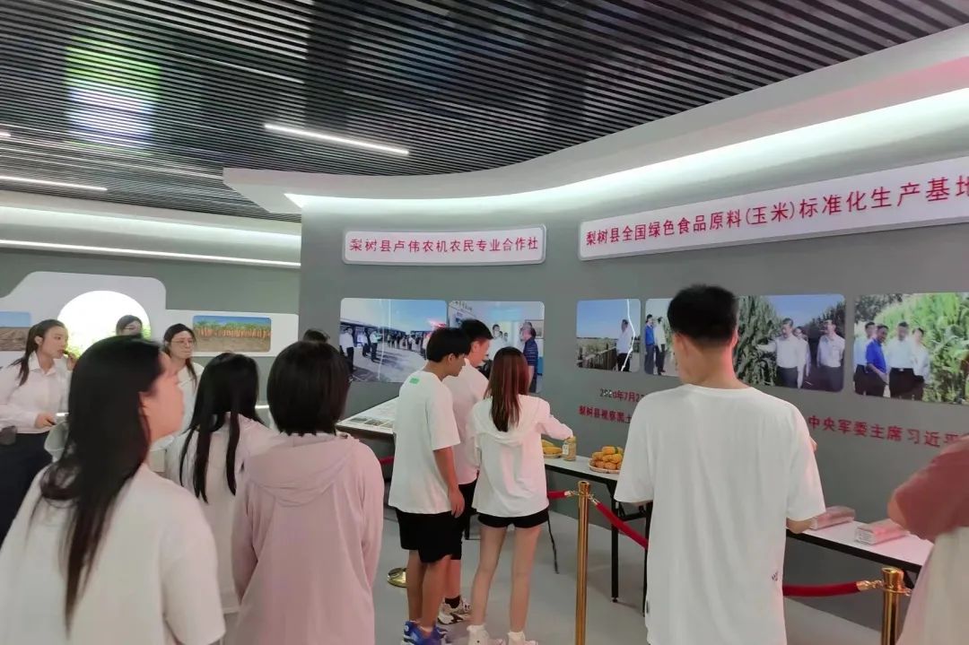 随后,团队前往梨树县全国百万亩玉米绿色原料基地,齐整的玉米苗亭亭玉立,颗粒饱满。极目远眺,湛蓝的天空下,大地无垠,翠海无边。通过讲解员的现场教学,同学们参观学习梨树模式,进一步了解学习到保障粮食安全的重要性。