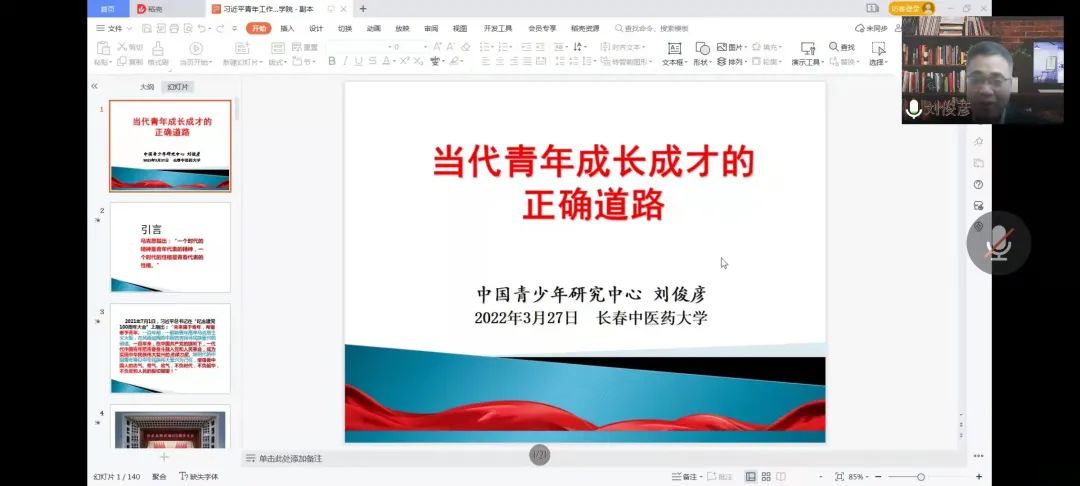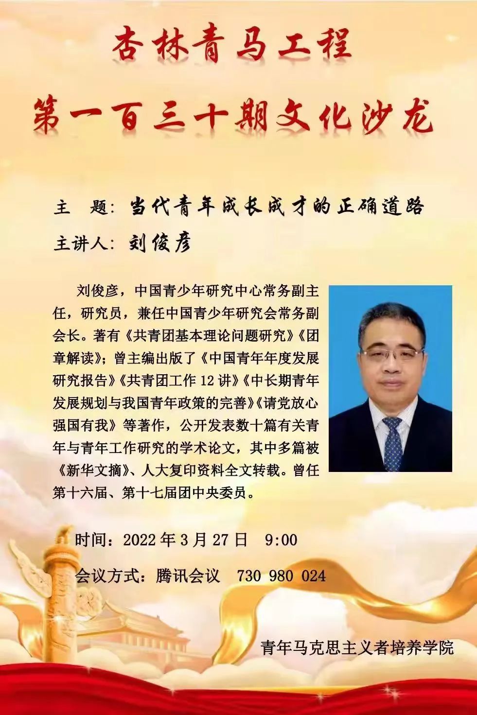 2022年3月27日,bat365官方官网杏林青马工程以“当代青年成长成才的正确道路”为主题举办第一百三十期文化沙龙活动。本次文化沙龙由中国青少年研究中心常务副主任,研究员,兼任中国青少年研究会常务副会长刘俊彦担任主讲嘉宾。